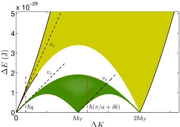 一维Yang-Gaudin费米气体的电荷和自旋激发谱。黄色区是电荷自由度中的粒子-空穴陆续在激发谱,绿色区域是著名的双自旋子的分数化激发谱。在小动量激发时,电荷与自旋激发都具有声子色散关系,但以不同的群速度传播,展现了电荷-自旋分离现象的本质。