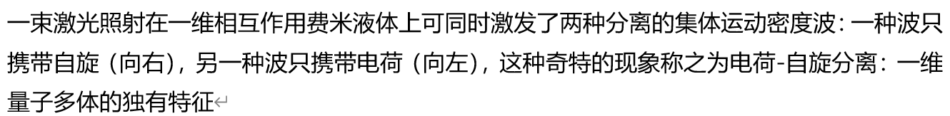 粒子间复杂的相互作用和系统丰富的内部自由度通常给系统物理特性的描述带来巨大挑战。在一维量子多体物理中,朝永-拉亭戈液体理论通常被用来描述一维多体系统的低能普适行为。一维相互作用费米子的低能激发通常会分裂成两支独立的朝永-拉亭戈液体,它们分别刻画携带自旋和电荷的分数化准粒子的集体运动,这种现象被称为自旋-电荷分离,参见图一。它是一维量子多体物理中独特的普适规律。尽管这方面的研究有40多年的历史,人们也在一维固体材料发现一些与自旋-电荷分离现象相关的证据(evidence),然而对于这种现象至今缺乏确定性(conclusive)的实验验证,理论如何表征自旋-电荷分离现象以及相关实验的调控方法都是公认的世界性难题。